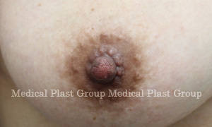 乳頭の大きさも気にされていたため乳頭縮小術と同時にモントゴメリー腺を除去しています。